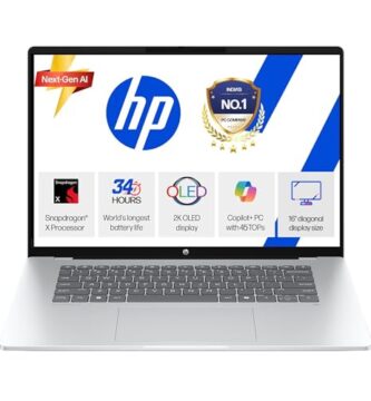 HP Omnibook 5 OLED (Previously Pavilion), Snapdragon X Processor (16GB LPDDR5x,1TB SSD) 2K OLED,16”/40.6cm, Win11, M365*Office24, Glacier Silver, 1.59kg, fb0001QU, Backlit, Next-Gen AI Laptop